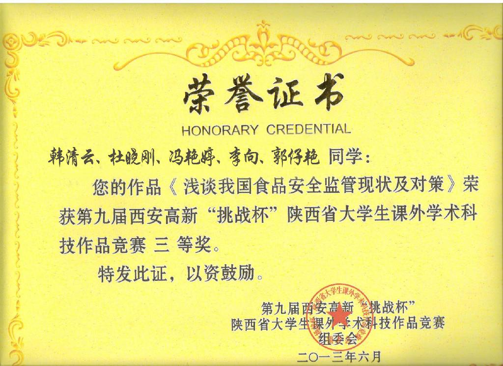 日前,2013年第九届西安高新“挑战杯”陕西省老员工课外学术科技作品竞赛评审结果揭晓,由公司朱新鹏、杨薇老师指导的作品《浅谈我国食品安全监管现状及对策》(参赛员工11级韩清云、杜晓刚、冯艳婷、李向、郭仔艳)获得省级三等奖。