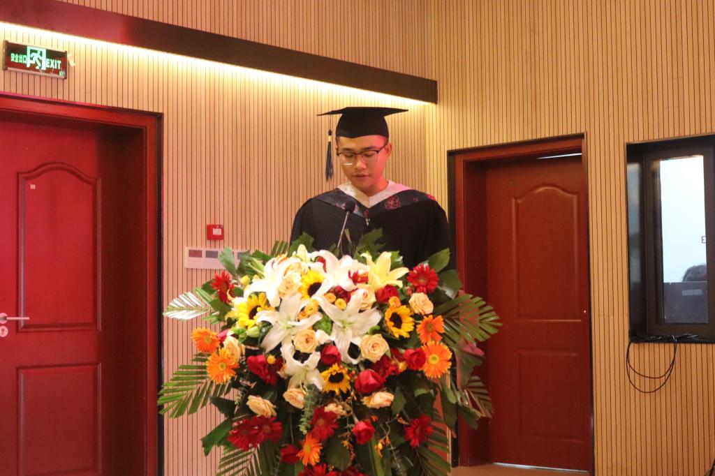 毕业生代表2021届食品科学与工程专业王佳豪同学发言。四年美好的大学时光,我们收获满满,感谢母校对我们的辛勤培育,感谢老师教给了我们知识、教会了我们做人、做事,表示要牢记老师的谆谆教诲,不忘师生情,同学情。以优异的成绩回报母校,回报社会。