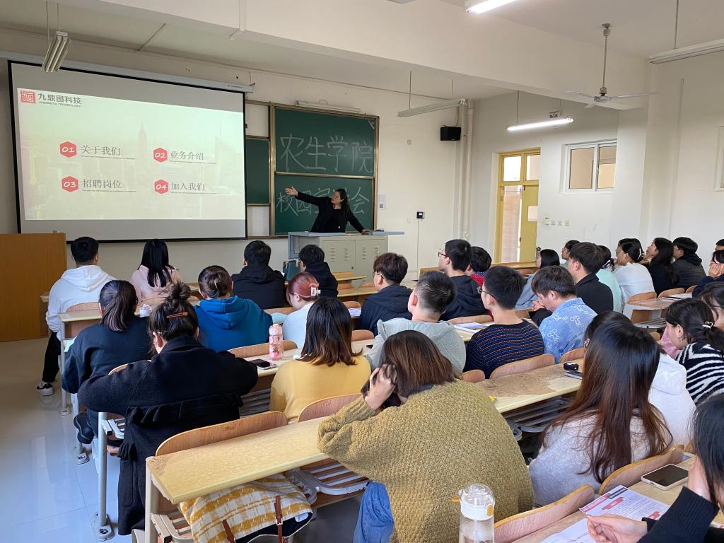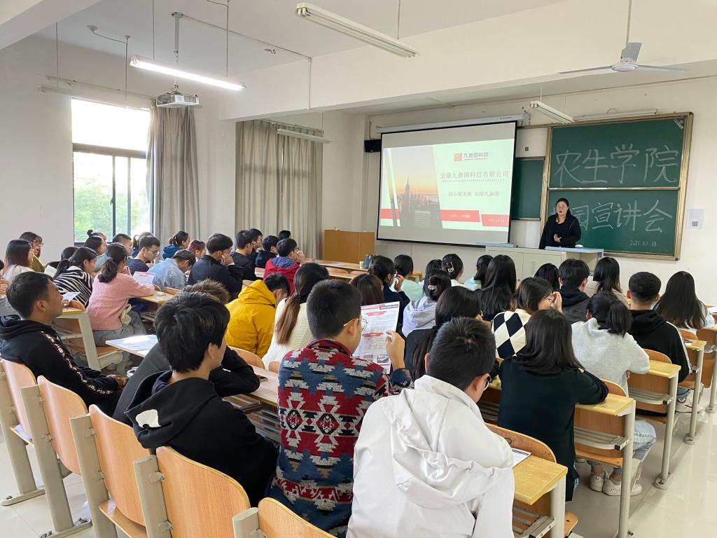 10月18日下午,安康九鼎图科技有限公司在1108教室召开校园宣讲会, 太阳成集团tyc33455cc官网辅导员张伟艺及园林专业70余名毕业生参加了本次会议。宣讲会由该公司乔福磊经理主讲。