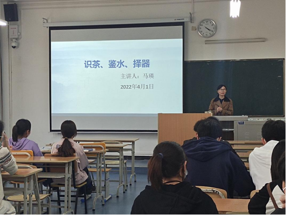 4月1日,茶青社在江北校区1219教室举办由指导老师马瑛主解的“识茶、鉴水、择器”茶艺知识讲座,有40余名茶艺爱好者参加,讲座由茶青社社长侯思同主持。马瑛老师用大量精美的图片为同学们讲解了六大茶类的特点、冲泡水温的选择、茶器的识别及搭配。
