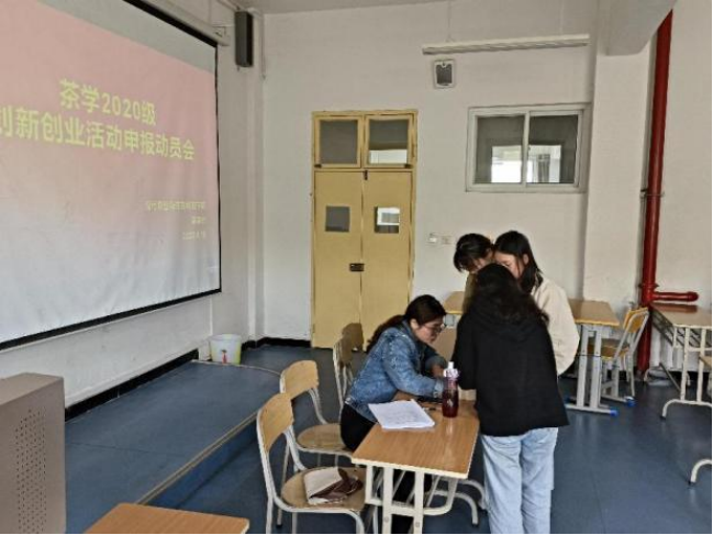 2022年4月18日, 太阳成集团tyc33455cc官网茶学系2020级茶学全体同学在茶学系系主任李冬花老师和吴冲老师的组织下,于江北校区1209教室召开创新创业项目申报动员会。