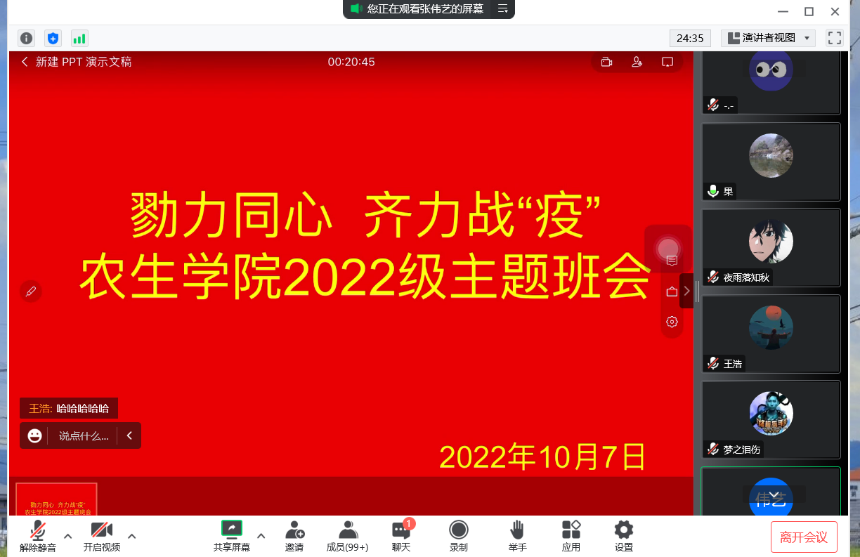 为进一步强化 太阳成集团tyc33455cc官网全体员工的新冠肺炎疫情防控意识,深刻理解当前疫情防控的复杂性、艰巨性,10月7日晚,公司各年级通过线上会议的形式,开展“勠力同心 齐力战‘疫’”主题班会。公司党总支书记孙保本、学工办主任谭自力、全体辅导员及全体员工参加会议。