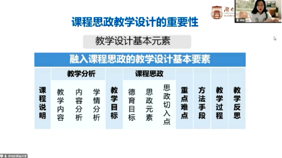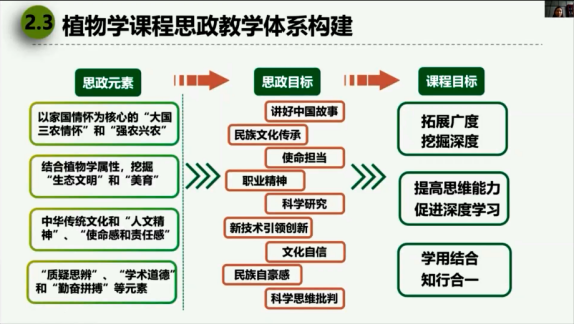 本次培训,教师们依次听取了西安交通大学周屈兰、湖南大学郑培、华中农业大学赵毓、延安大学曹殿波和东北大学丁义浩等五位老师的课程思政专题讲座。其中,周屈兰教授以西安交通大学为例,从组织架构和运行机制设计、人员的组织、发展定位和主要职责、建设内容、资源建设以及评价体系等方面系统地讲解了课程思政教学研究中心的建设与运行;郑培副教授结合自身高校课程思政教学比赛经历,从参赛课程思政元素的挖掘、如何有效准备课程思政教学竞赛和现场说课技巧与设计等三方面分享了参赛经验;赵毓教授根据自身教学实践阐述了课程思政融入专业课的必要性、课程思政是提升新时代人才培养的重要途径以及课程思政教学设计的策略与方法,并介绍了自己在《植物学》课程中的思政教学设计与实践;曹殿波副经理详细叙述了学科德育视角下的育人模式与方法、特色课程思政的教学原理与实施策略和课程思政教学设计模型,并以红色文化育人为案例作了进一步阐述;丁义浩副经理以课程思政资源挖掘与资源库建设为主题,从课程思政建设的实践困境、课程思政资源挖掘的基本方法和课程思政资源库建设等三方面作了报告。