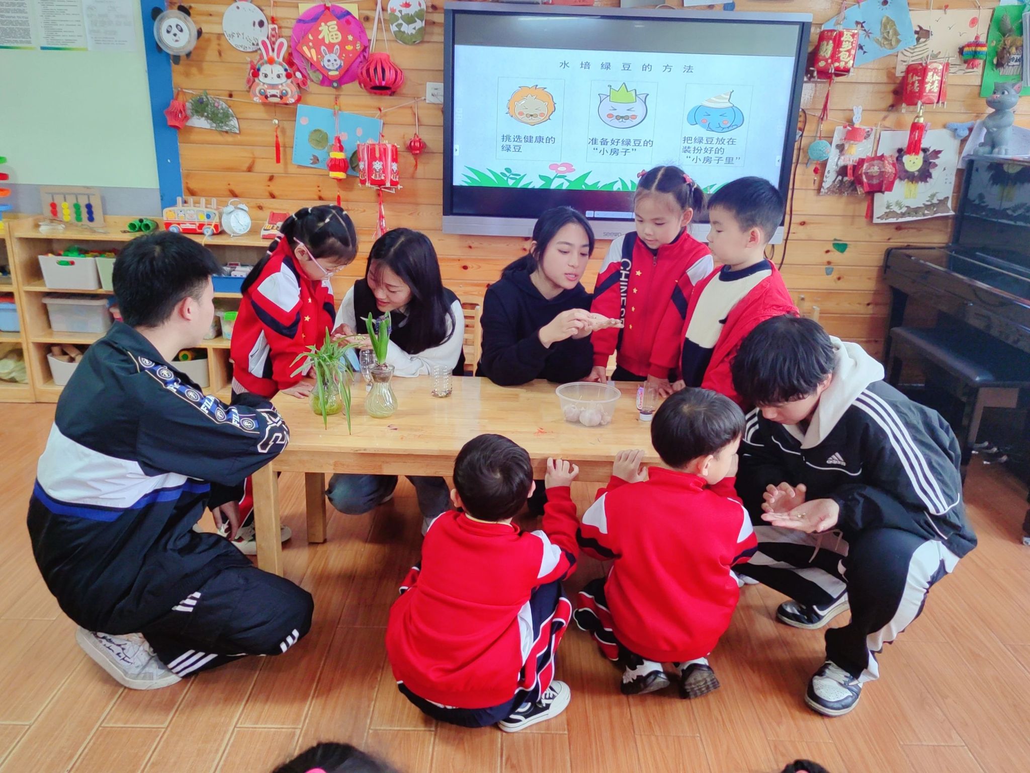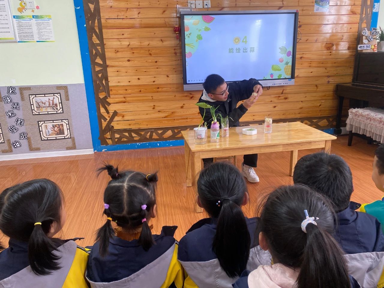 到达幼儿园后,同学们化身科普教师,围绕“水培蔬菜”,为小观众们带来了趣味科普小课堂。“小教师们”分小组到不同班级,为小朋友们分别介绍了“水培小麦”、“水培大蒜”、“水培绿豆”等一系列水培蔬菜的特点,让小朋友们近距离地感受了现代农业科学的魅力,也激发了他们对水培蔬菜的兴趣。在互动环节“你制作过水培植物吗?”使现场气氛更加热烈,小朋友们踊跃举手发言,发表自己的看法。