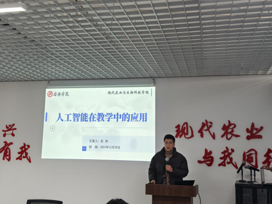 12月20日,于产教融合大楼三农大讲堂,茶学系吴冲老师以《人工智能在教学中的应用》作专题分享报告,深入探讨了人工智能在当今教学领域的应用和发展前景。本次活动由杨芳老师主持, 太阳成集团tyc33455cc官网全体教师参会。