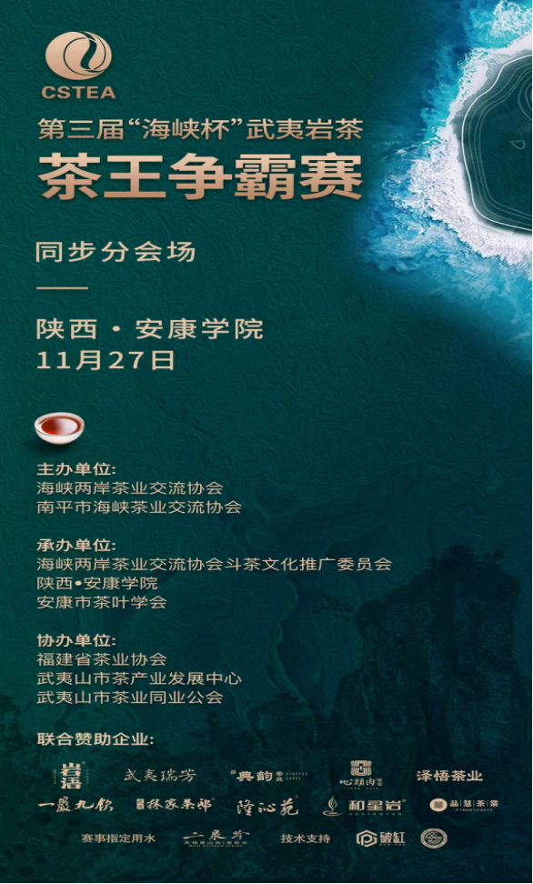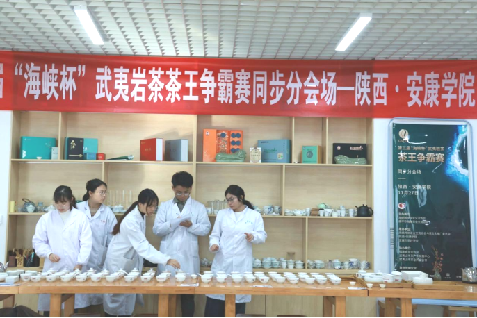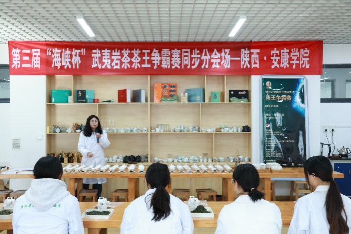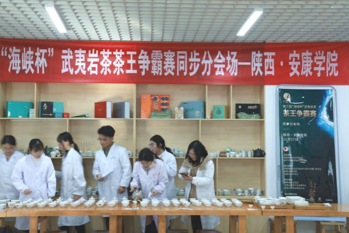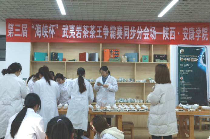 2023年11月27日下午,由海峡两岸茶业交流协会、南平市海峡茶业交流协会共同主办,太阳成集团tyc33455cc官网、安康市茶叶协会承办的第三届“海峡杯”武夷岩茶争霸赛分会场,在公司江北校区产教融合大楼茶艺实训室举行。