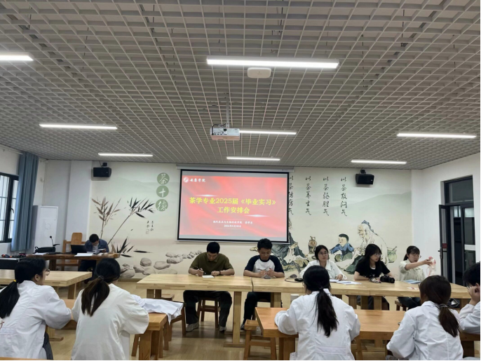 5月10日,茶学系于产教融合大楼茶艺实验室召开2025届《毕业实习》工作安排会,会议围绕实习意义与重要性、实习安全与要求等方面进行深入讨论和全面部署,旨在帮助员工更好地理解和准备即将到来的毕业实习,确保实习工作的顺利进行。茶学系主任李冬花及茶学专业教师齐玉岗、程晓梅、袁月、常娜、吴冲及2021级全体员工参会。