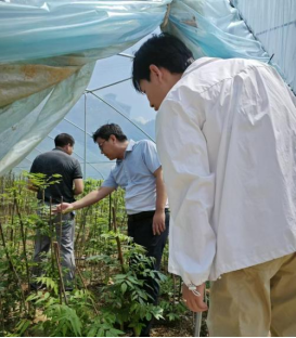 在旬阳桥沟花场,实践团队成员与种植管理员探讨香椿种植过程中的关键环节和疑难问题,进行农业生产技术交流。
