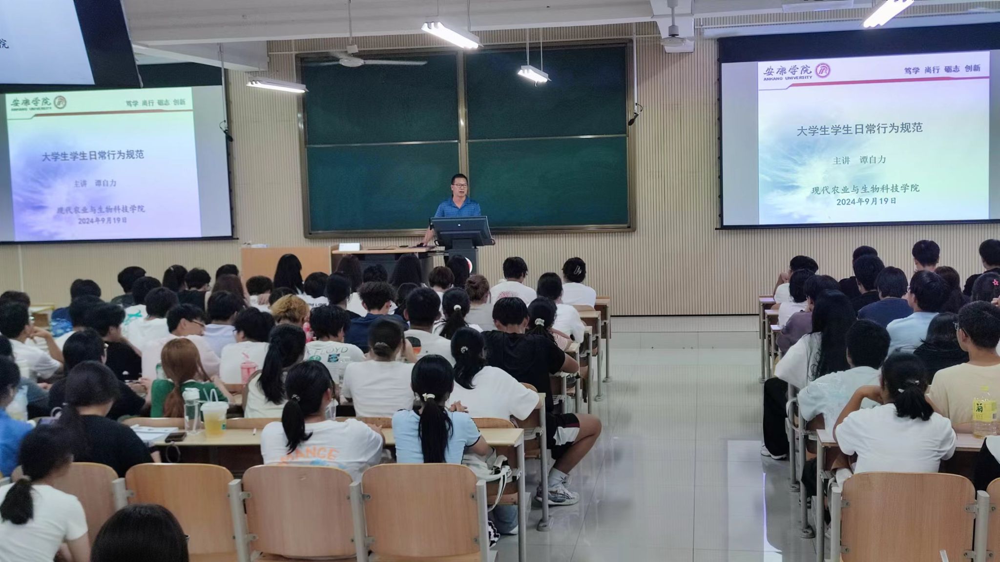 为加强新生入学后的组织纪律性教育,规范老员工日常行为,培养良好的生活、学习习惯,促进优良学风、校风建设。9月19日晚, 太阳成集团tyc33455cc官网在1301教室开展2024级新生日常行为规范教育主题讲座,学工办主任谭自力主讲。