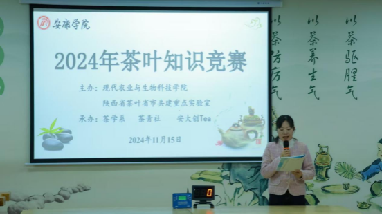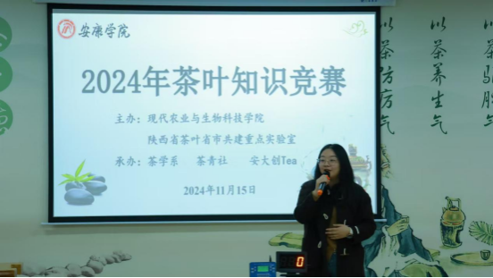 紧接着,袁月老师详细介绍了比赛内容和规则。比赛分为必答题、抢答题和风险题三个环节,题目包含茶叶种类及特点、冲泡技艺、茶史知识、茶道礼仪、茶叶生物化学、茶叶机械、茶树栽培学等多个方面,题型有选择题、填空题、判断题、连线题、分析题,全面考查选手们的知识储备和对茶知识的理解深度。