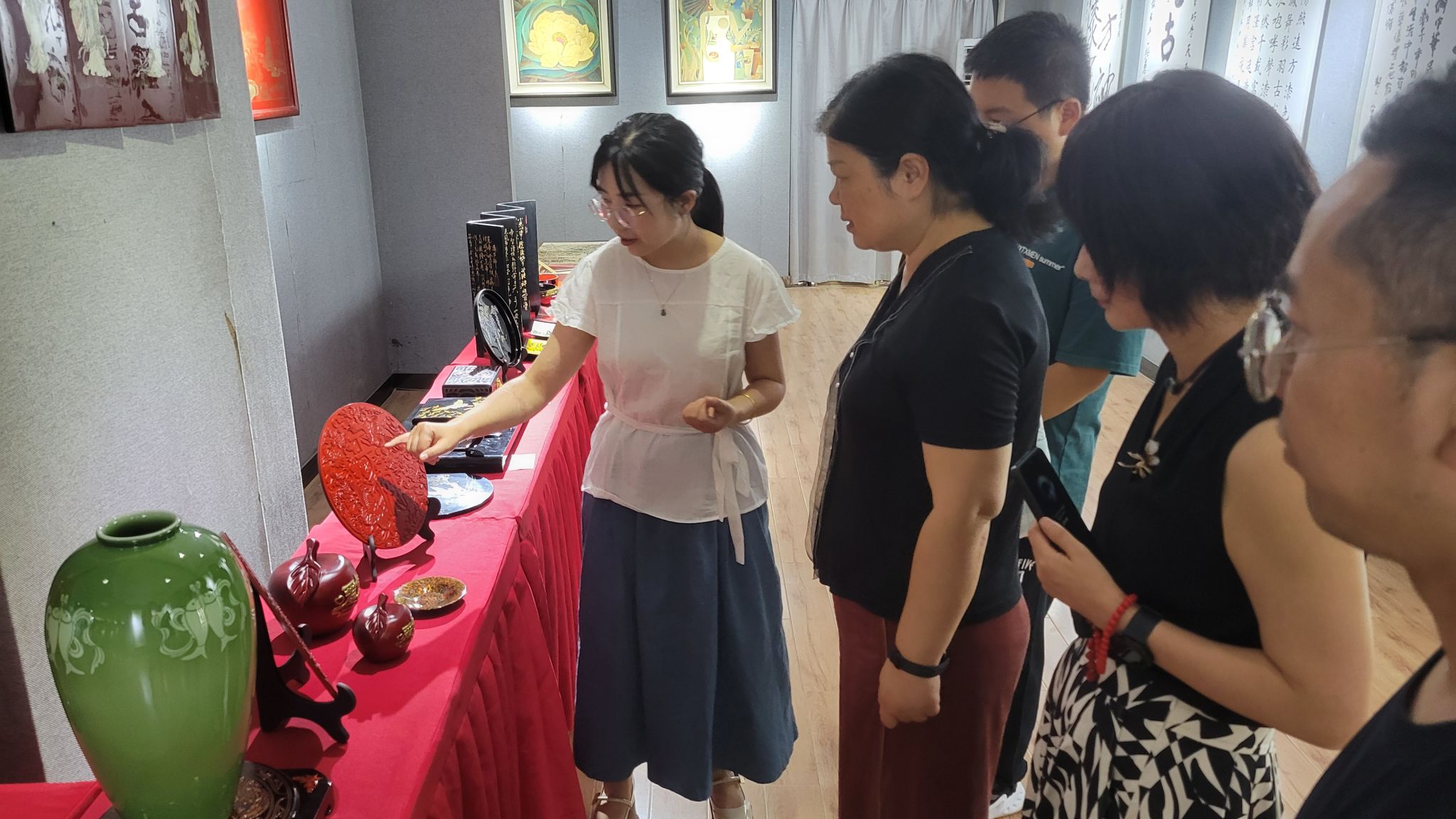 在讲解教师的引领下,公司师生系统了解了漆器从原料选取与处理、底漆涂刷、花纹描绘到成品打磨等关键制作环节,并针对不同工艺在质感和艺术表现上的差异作了深入阐述。师生分组驻足观摩,通过近距离鉴赏典型纹样和结构细节,进一步加深了对漆艺工艺流程的认识。