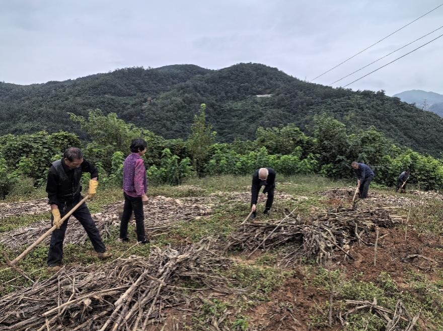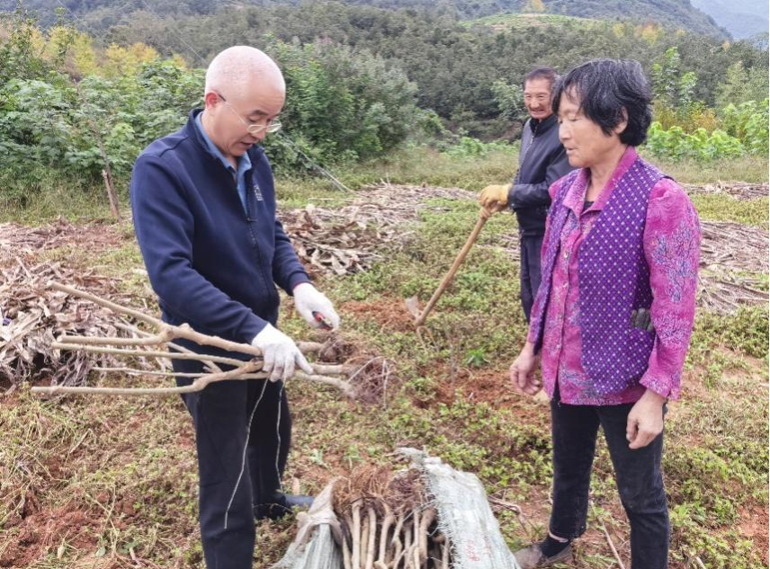 在桑园种植基地,彭云武研究员向农户详细讲解了水肥管理、整形修枝等果桑栽培关键技术,并现场演示了种植前的根系修剪方法。结合当地地形条件,两位老师为汉江村科学规划了果桑种植的行间距布局,并重点强调“深挖浅栽”原则,以平衡根系生长与土壤透气性,确保苗木成活率。随后,两位老师与农户一同动手,共同完成了果桑苗木的定植工作。