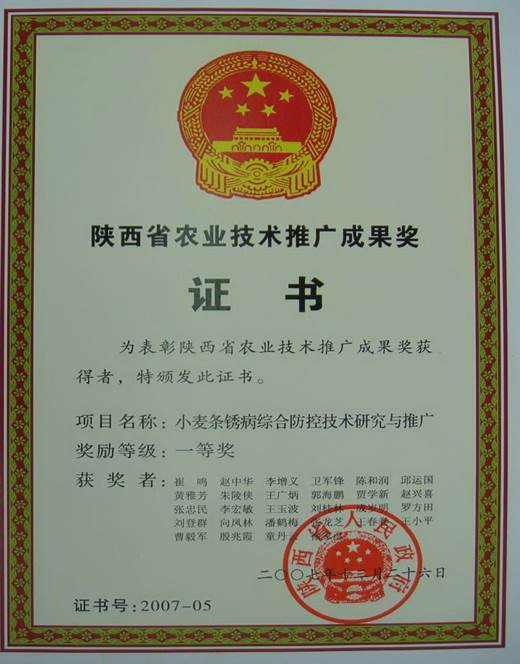 主要内容:该成果理清了安康市小麦条锈病发病规律,对不同播期、耕作栽培方式、生物多样性、品种抗性等农业技术措施对小麦条锈病的影响进行了研究,筛选出适合山区的小麦药剂拌种方法和技术,实行农业、生态控制和化学防治有机结合,通过技术集成,实现综合防控。该项成果获得2007年陕西省农业技术推广一等奖。