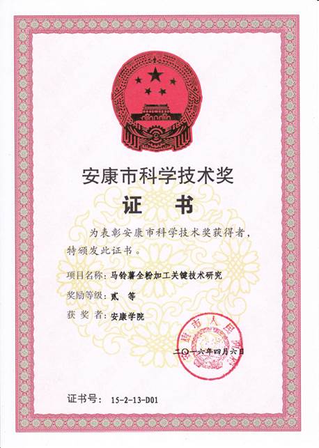 主要内容:以马铃薯全粉生产及其再制品加工为研究内容,以安康所产马铃薯为原料,进行品种间褐变比较(多酚氧化酶、过氧化物酶活性比较)及护色剂优化、干燥工艺比较以完善加工工艺;对所制全粉营养和功能指标进行分析,以明确不同原料所制全粉的适用范围;研究开发2种全粉产品(马铃薯冲调营养粉、马铃薯桃酥)。该成果获安康市科学技术成果二等奖。
