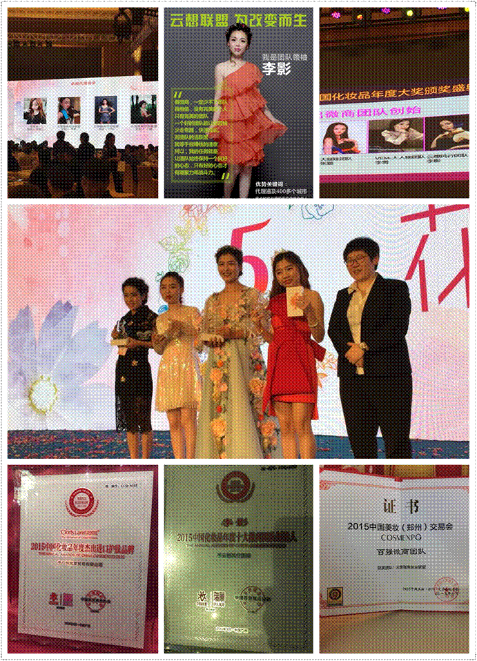 云想风行国际微商团队创始人——李影,一个永远不懂输,认准一件事情,就会一路坚持下去,其中经历过半夜抱头痛哭,经历过孤寂和痛苦,几乎到绝望的境地,还是能够咬牙前行!就是这样一个经历过生活洗礼的女子,带领着一群志同道合的人在一起,干一件一生都干不完的有意义的事!从最初的孤身一人,到成立了云想风行国际,一切都那么地艰难,但从未退缩,她的努力没有白费,目前团队人数已经突破2万人,并且得到业界的充分肯定。2015年7月云想风行国际被中国美妆交易会授予百强微商团队。花皙蔻也成为2015中国化妆品年度杰出进口护肤品牌,同年李影被公司授予花皙蔻微商卓越代理商奖。2016年3月第十届中国化妆年度风尚大奖颁奖盛典,李影又荣获年度杰出微商团队创始人。