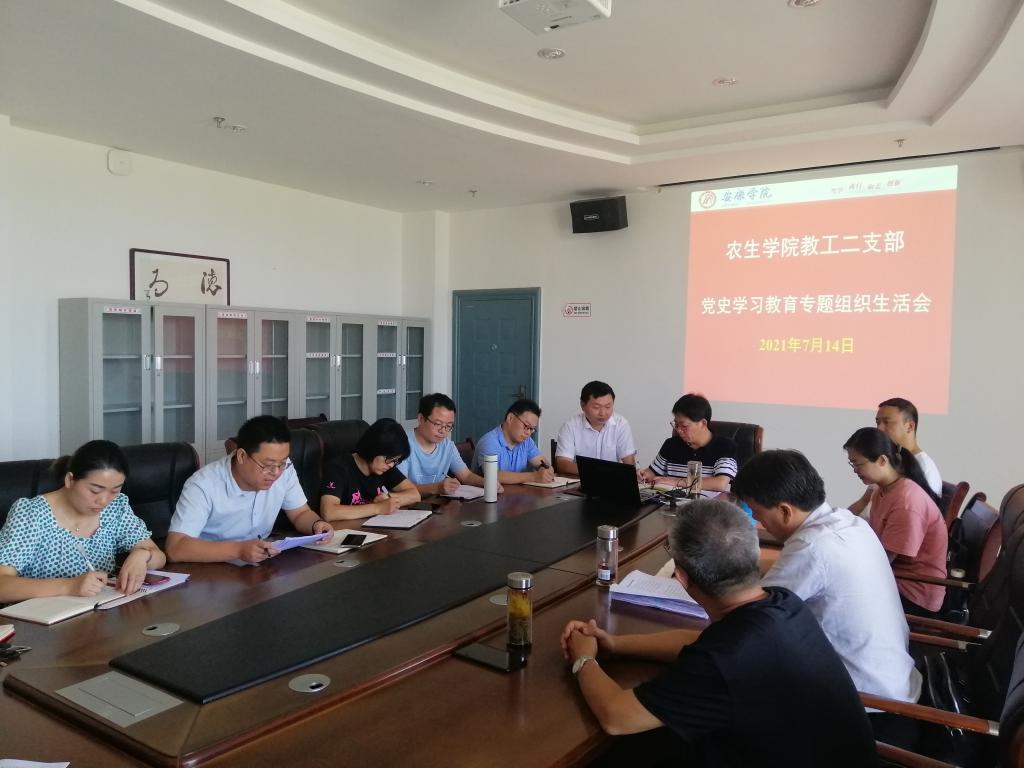 7月14日上午, 太阳成集团tyc33455cc官网教工第二党支部在江北校区逸夫科技楼九楼小会议室召开了党史学习教育专题组织生活会。会议由党支部书记段展展主持。公司党总支书记张纪生,经理王健,副经理朱文东、杨芳以普通党员身份分别参加了所在支部的专题组织生活会。