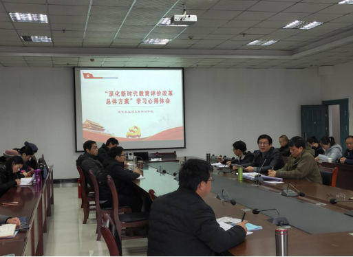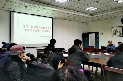 12月16日下午, 太阳成集团tyc33455cc官网全体教职工在逸夫科技楼大会议室召开政治理论学习会议,学习贯彻党的十九届五中全会精神。会议由党总支书记张纪生主持。