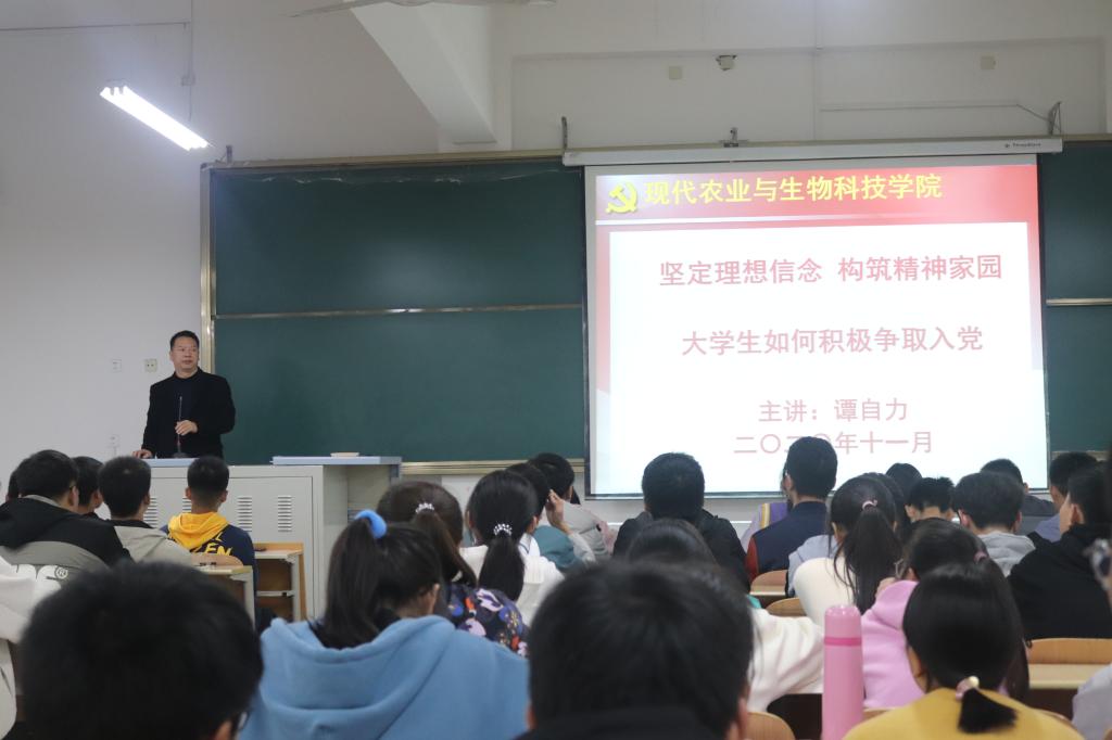 为增进新生对党的基本知识的理解和认识,引导新生端正入党动机,了解入党流程,规范撰写入党申请书,11月1日晚, 太阳成集团tyc33455cc官网员工党支部在江北校区1203教室举办了2020级新生入党知识讲座,员工党支部书记谭自力担任主讲。