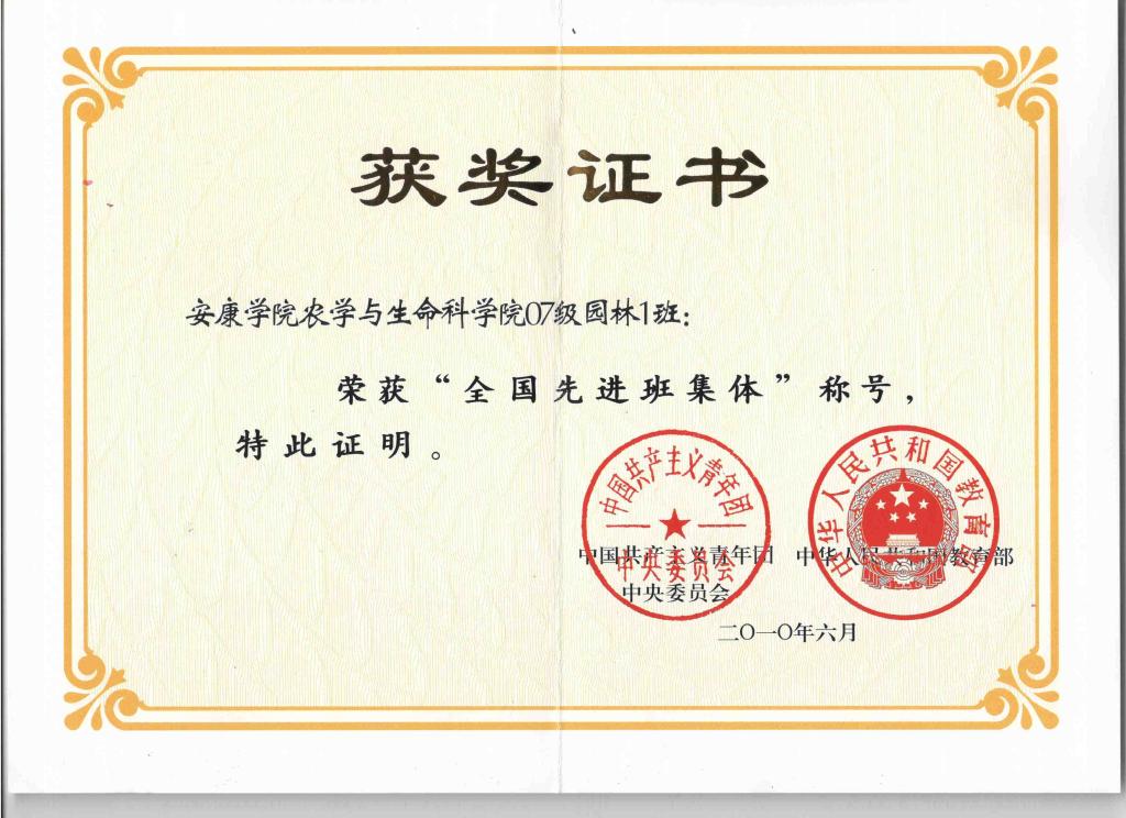 2010年6月2007级园林1班获得“全国先进班集体”称号